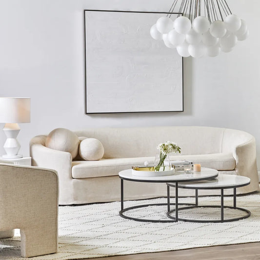 Transform your home into a modern contemporary sanctuary with our Cloud Nine Living Room Package. A curated collection designed to inspire comfort, elegance, and style. Featuring the dreamy Cloud Pendant, Parisian-inspired Elle 3-Seater Slip Cover Sofa, versatile Chloe Stone Nesting Coffee Tables, chic Kylie Armchair, and statement-making Archibald Floor Mirror, this package blends soft curves,