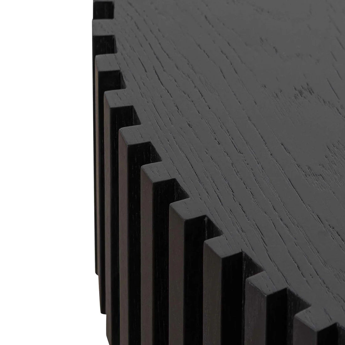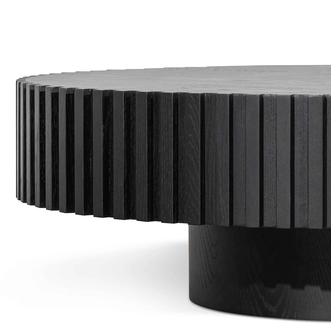 Crafted from robust engineered wood with a luxurious black oak veneer, this Alfaro Round Coffee Table embodies refined elegance. The distinguished reeded wood body showcases vertical detailing that creates visual intrigue. Its perfectly proportioned 40cm diameter and substantial 20cm thickness offer both presence and practicality. The precise edges and circular silhouette bring a sophisticated geometric element to your living space. With minimal assembly, this statement piece introduces timeless sophistication and dramatic contrast to your interior aesthetic.