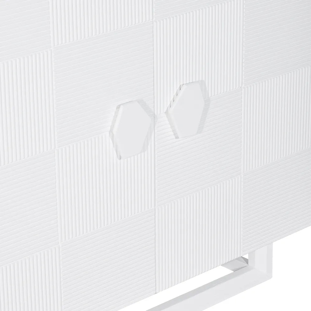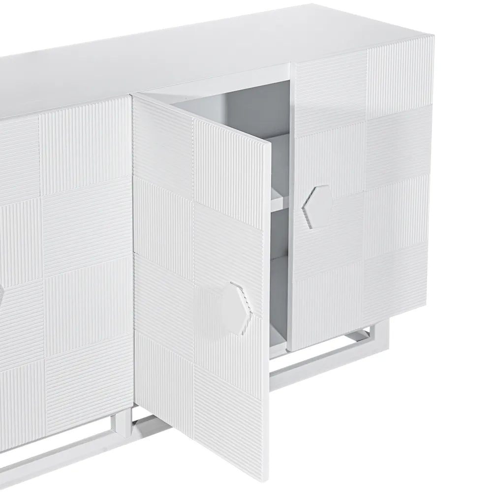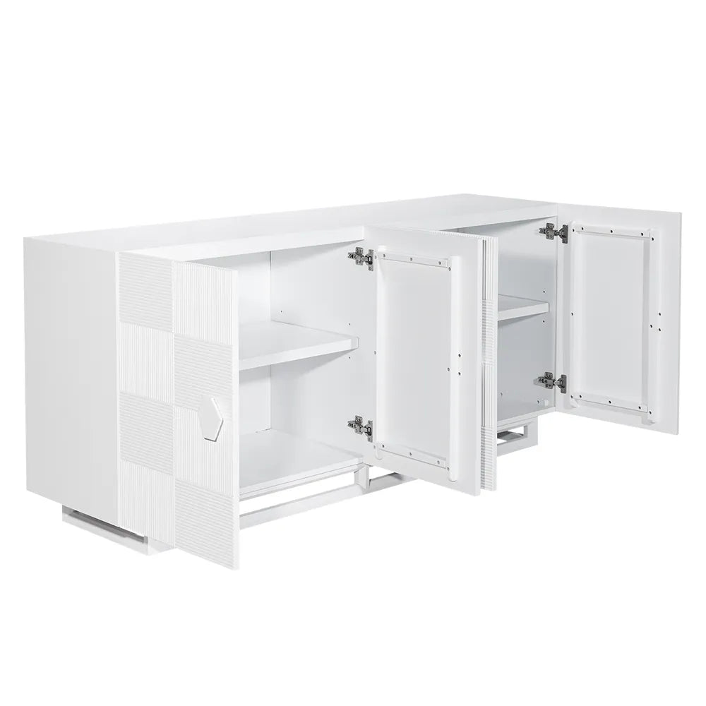 This luxurious buffet combines sleek design with functional elegance, featuring a premium acacia wood veneer finished in a crisp white hue. The contemporary fluted texture adds visual interest, while the four spacious cabinets offer ample storage for dining essentials or other household items. Adorned with unique hexagonal handles and a sturdy, elevated base, this buffet is both stylish and practical. Perfect for modern and minimalist interiors, it brings a refined touch to any dining room or living space.