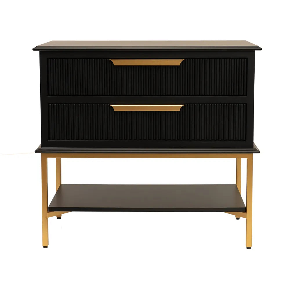 Drawing inspiration from chic Parisian interiors, the Aimee bedside table offers classic design for modern living. Exuding a contemporary touch with clean, modular styling and a chic satin black painted finish,the Aimee bedside table features two fluted drawers plus a bonus shelf for extra storage and display, set atop a simple and elegant gold metal frame. Finished with elegant gold metal hardware, the Aimee bedside lends a sophisticated modern edge to the spaces it inhabits.