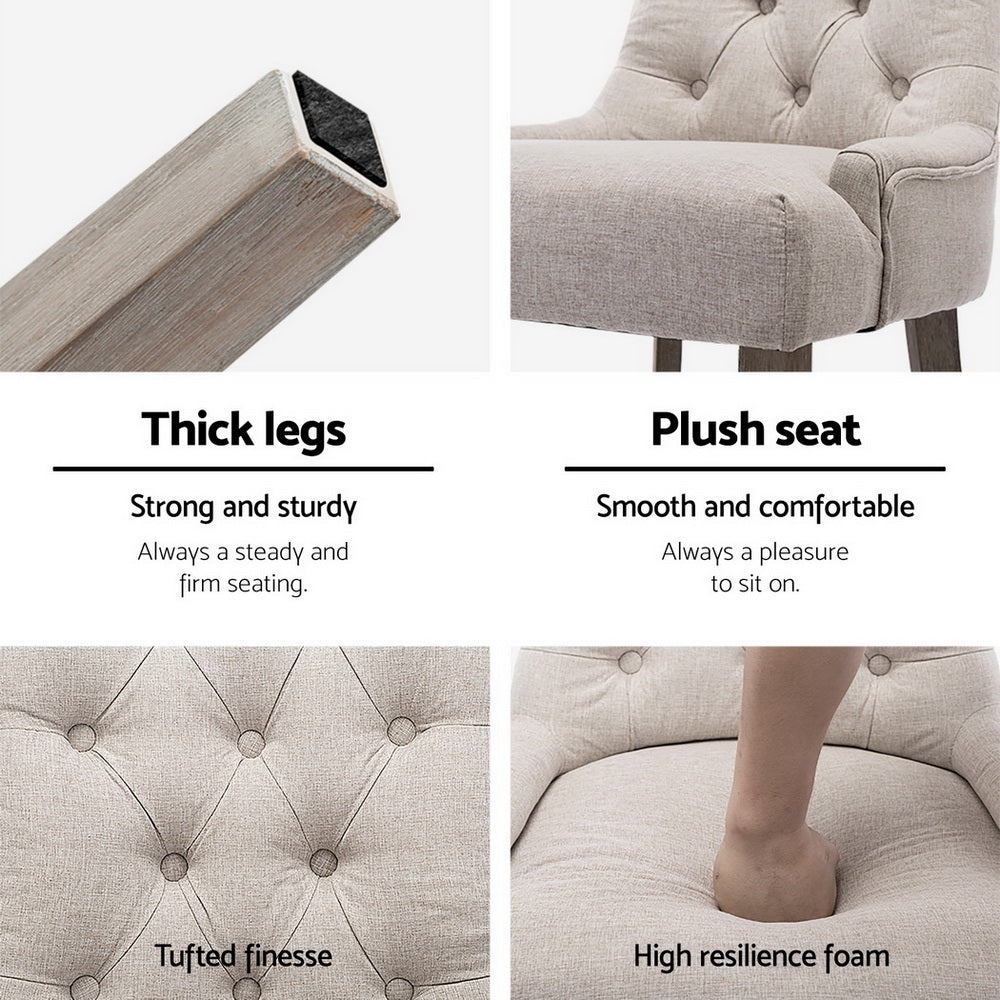 Transform your home with French Provincial charm with our timeless Cayes Dining Chair. Oozing myriads of class and sophistication, the Cayes Dining Chair is upholstered in quality amber taupe linen over deep 13cm high resilience foam and set over a rubber wood frame. The tufted button design of the back rest, and the iconic curved back legs and turned front legs all add to the overall charisma of this classic chair.