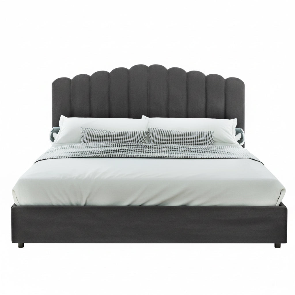 Introducing our elegant Fion bed frame, upholstered in velvet fabric, featuring a gas lift storage mechanism, wooden frame with slat support, padded headboard, smooth edge finish, and sturdy metal connectors for a blend of style and functionality in your bedroom.