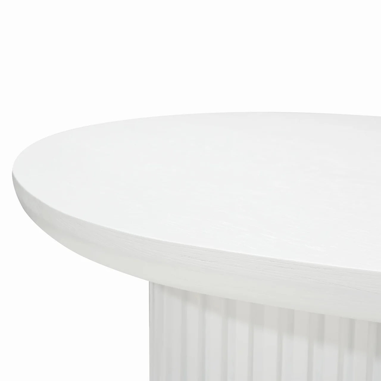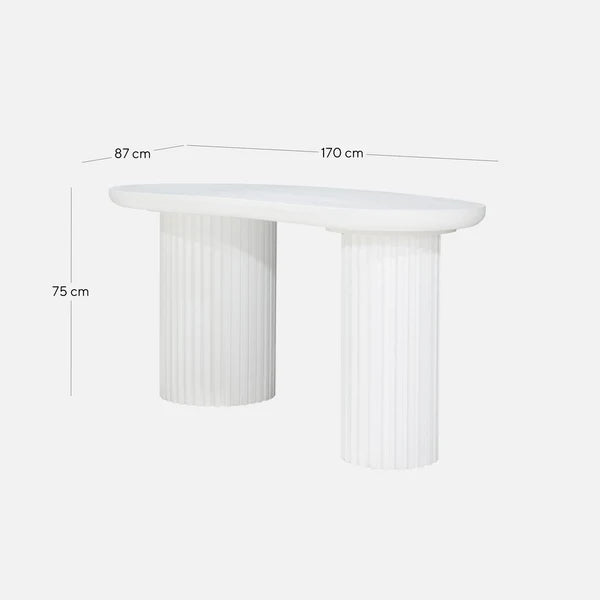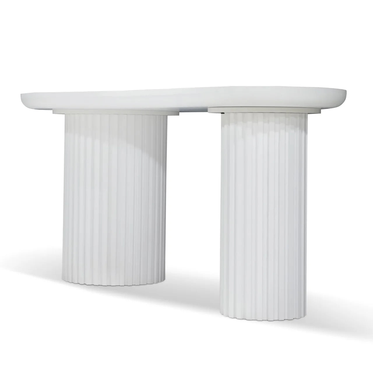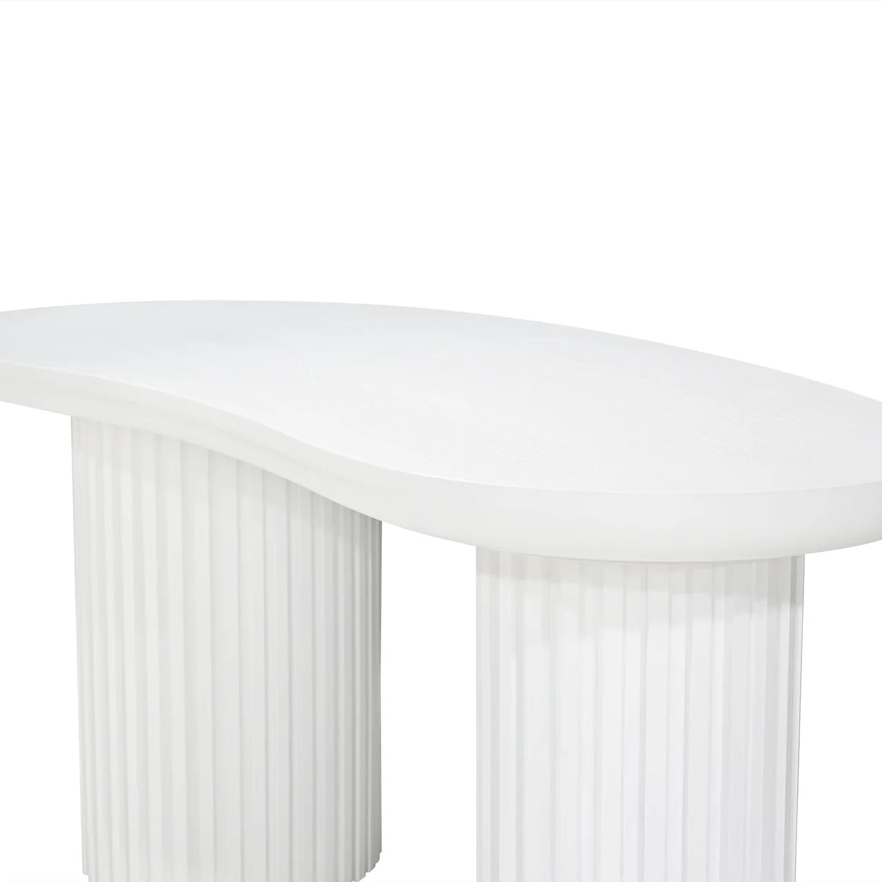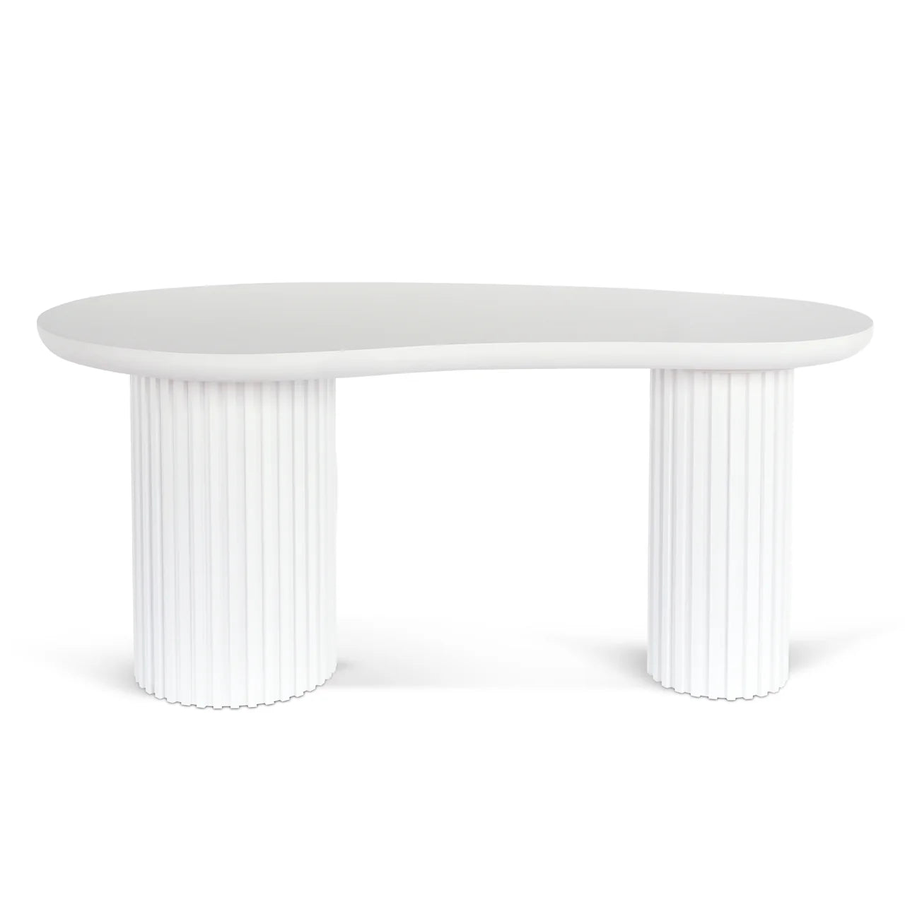 The Marty Office Desk showcases an engineered wood top and base finished in full white with water-based paint. Its distinctive bean-shaped tabletop highlights visible wood grain patterns, supported by cylinder-shaped legs featuring vertical wood panels. Assembly is minimal for easy setup.