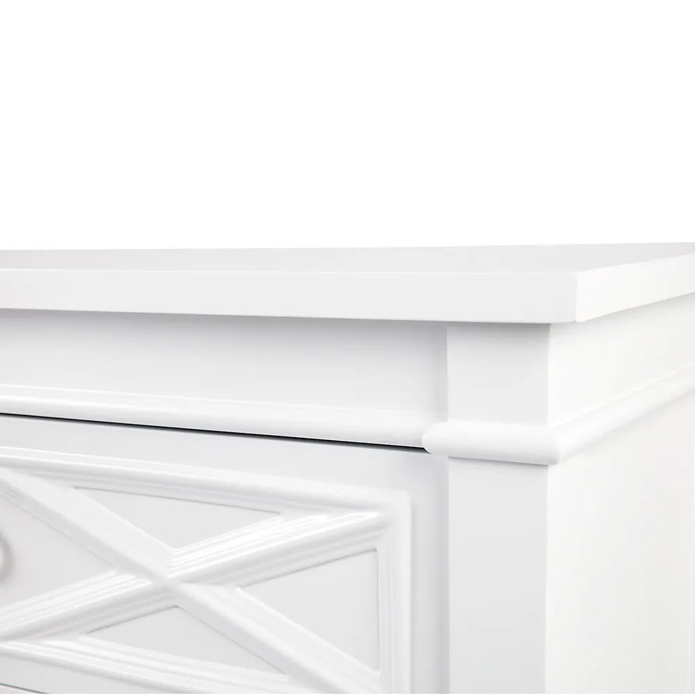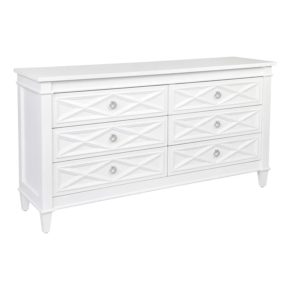Perfect for a sophisticated coastal or refined Hamptons interior style, the Plantation range is one of our favourites at CAFE Lighting and Living, that incorporates all the classic elements into a functional and stylish design. A raised diamond pattern adorns the front of the Plantation six drawer chest, a crisp white satin finish complimented with polished silver handles enhances a simple neutral colour palette, whilst allowing you to maintain a crisp and open space.